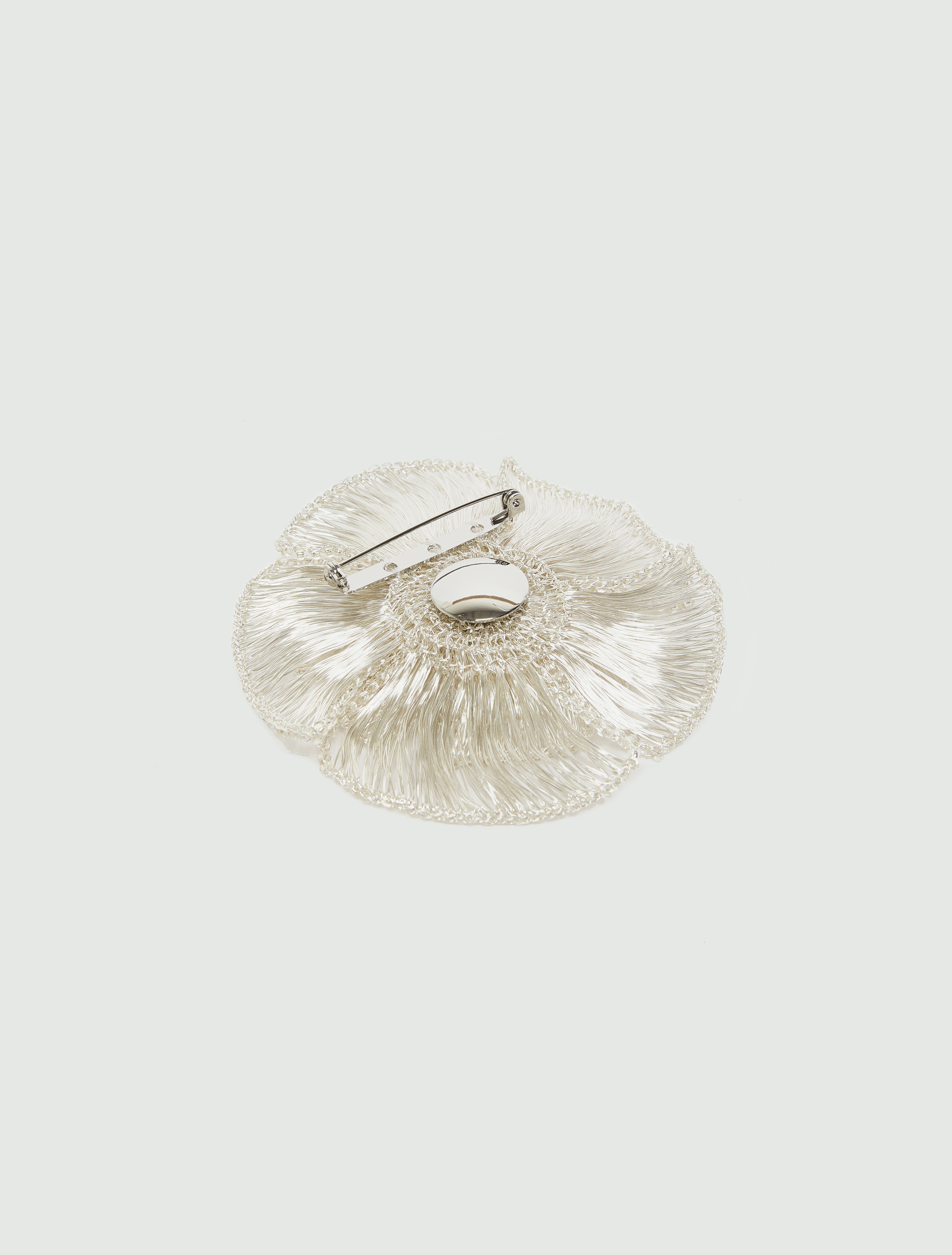 - Brooch featuring bead-adorned, crochet-knit metallic thread flower detail